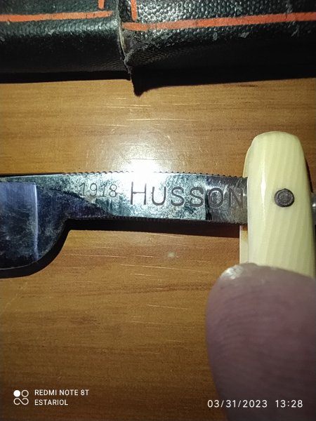 1918 Husson Thoso (nit sam čuo nit našao nešto o ovome, ali sam ga kupio jer je napravljen od Kayser Ellison Šefildskog Silver Steel-a. 11/16, celuloidna drška (mislim), i nareckan je i sa gornje i sa donje strane tang-a: